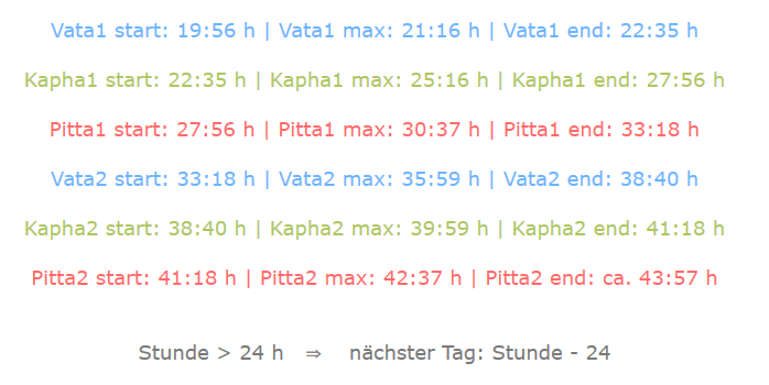 _____________________________________________________ Die Doshas werden namentlich benannt und in den üblichen Farben geschrieben. Jedes Dosha bekommt innerhalb 24 Stunden 2x die Vorherrschaft. Daher gibt es Vata 1 und Vata 2, Kapha 1 und Kapha 2 sowie Pitta 1 und Pitta 2. Auch hier beziehen sich sämliche Zeitangaben auf die Anzeigezeitzone, die zuvor in der rechten Eingabe-Spalte eingestellt wurde; diese Spalte ist im Beispiel nicht sichtbar. Zeitangaben größer 24 Stunden liegen kalendarisch im nächsten Tag (in Bezug auf die Anzeigezeitzone). Also Kapha1 max: 25:16 h ist morgen um (25:16 - 24:00 =) 01:16 Uhr. Oder Pitta2 start: 41:18 h ist morgen um (41:18 - 24:00 =) 17:18 Uhr. Solche starke Differenzen entstehen nur, wenn die Anzeigezeitzone sehr weit von der Geozeitzone weg liegt. Also zum Beispiel die Geokoordinaten von Hamburg mit der Zeitzone "Europe/Berlin" und der Anzeigezeitzone "America/Chicago", weil man sich vielleicht gerade in Chicago aufhält und sich an der dortigen Zeit orientieren möchte. |